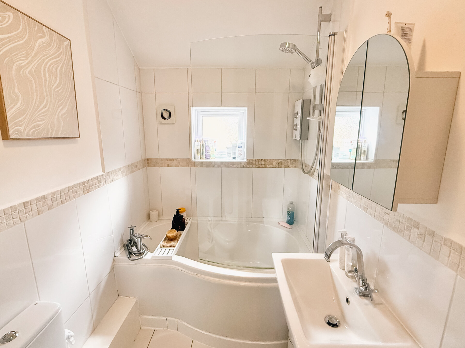Upstairs, two generous double bedrooms offer comfortable accommodation, each benefiting from natural light and neutral décor, while the modern family bathroom includes an over bath shower, ensuring convenience for daily routines.