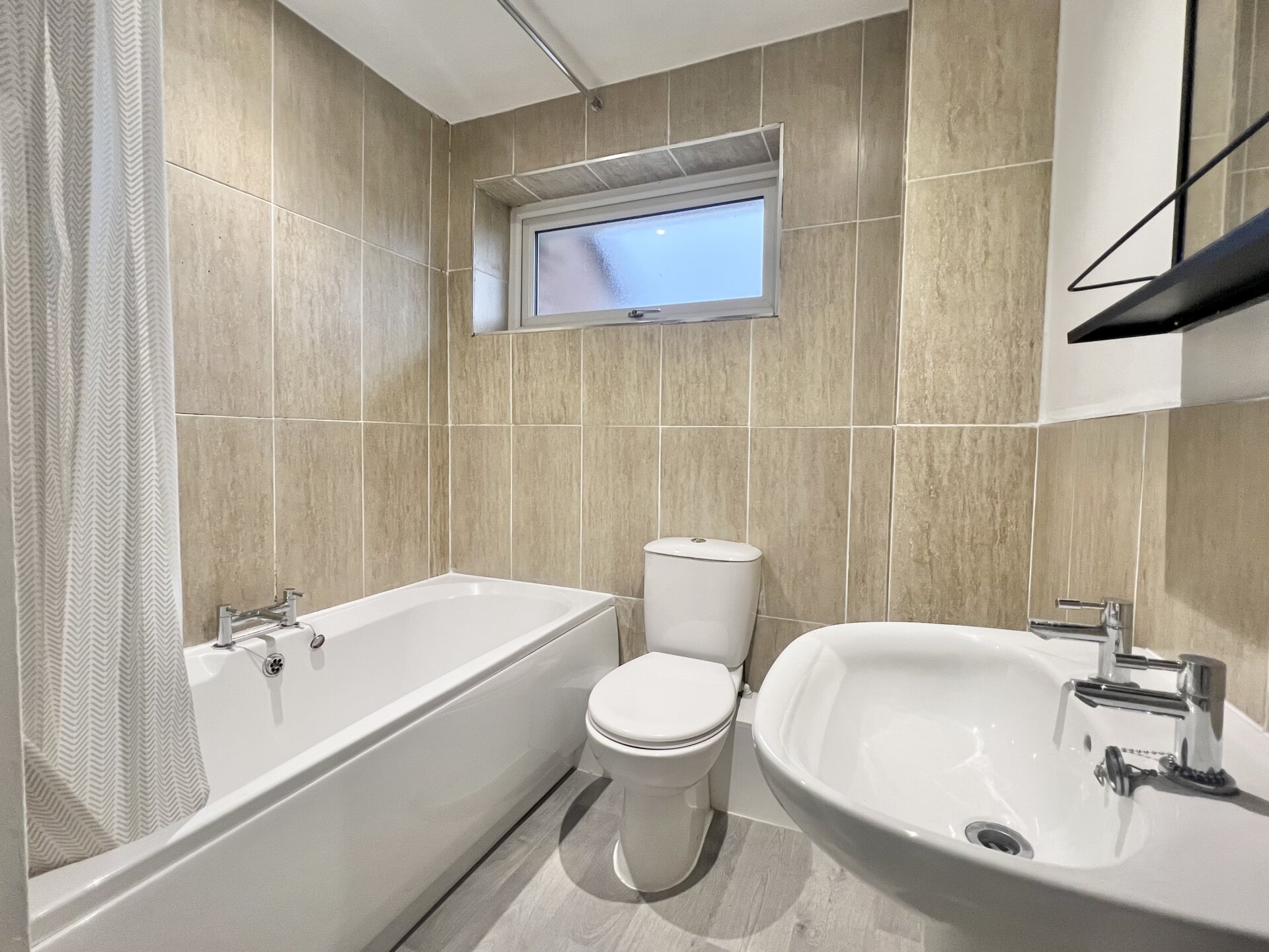 Three piece suite comprising pedestal wash hand basin, low flush WC, bath with shower over. Tiled walls and splashbacks, radiator, double glazed window, useful over-the-stairs storage cupboard.
