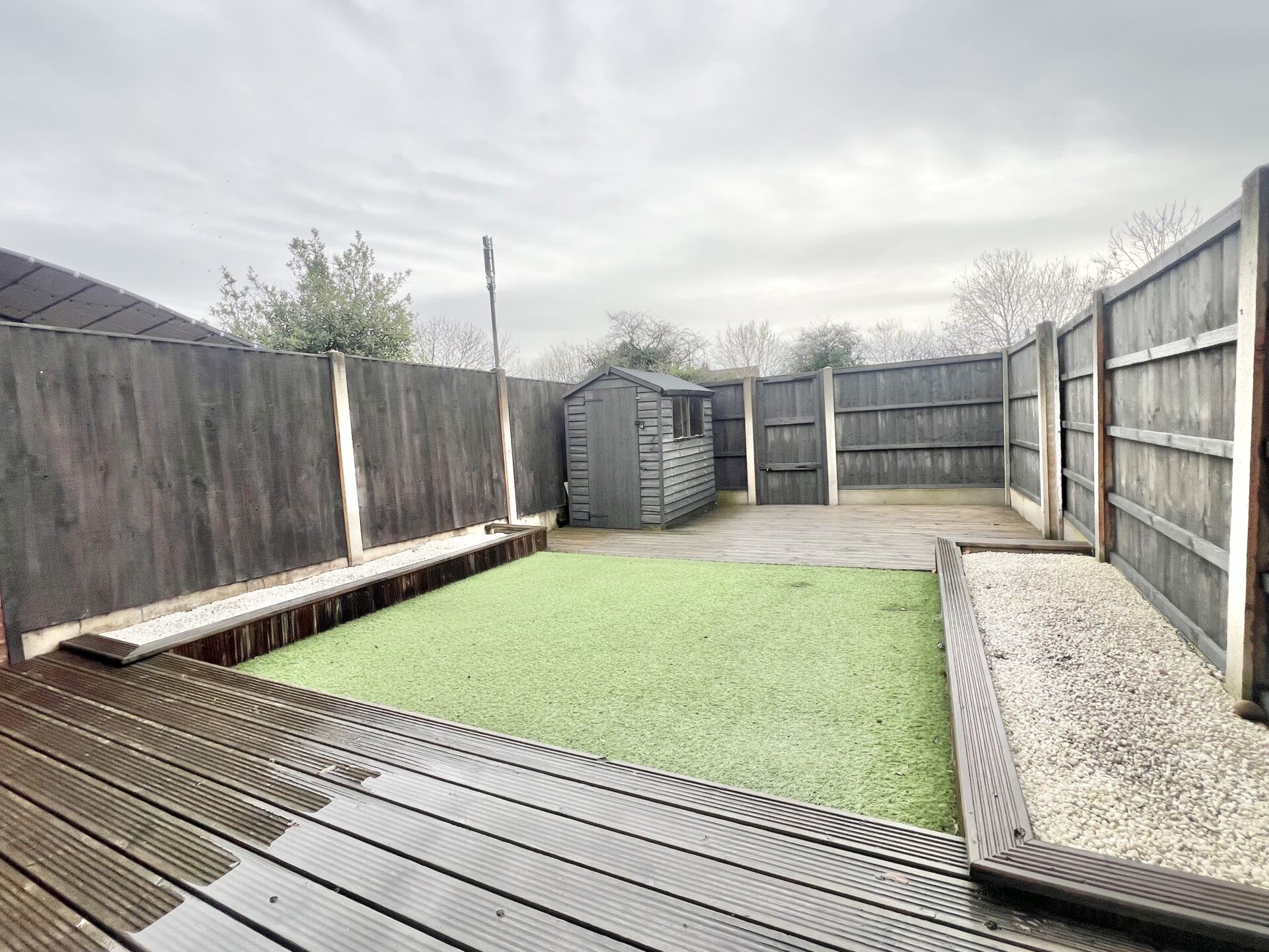 Outside, the property features a welcoming frontage with a fenced boundary and gate, leading to a path and an attractive astro turf lawn that provides year-round greenery with minimal maintenance. The rear garden has been thoughtfully landscaped, featuring an astro turf lawn and two decking areas that are perfect for relaxing or entertaining guests. Raised beds on either side offer scope for planting or additional landscaping, while a timber storage shed at the foot of the plot provides practical storage solutions. A pedestrian gate at the end of the garden gives direct access to the communal parking area at the rear, where ample unrestricted off-street parking is available for residents and visitors alike. This combination of well-maintained outdoor spaces and practical amenities ensures the property is as appealing outside as it is inside.