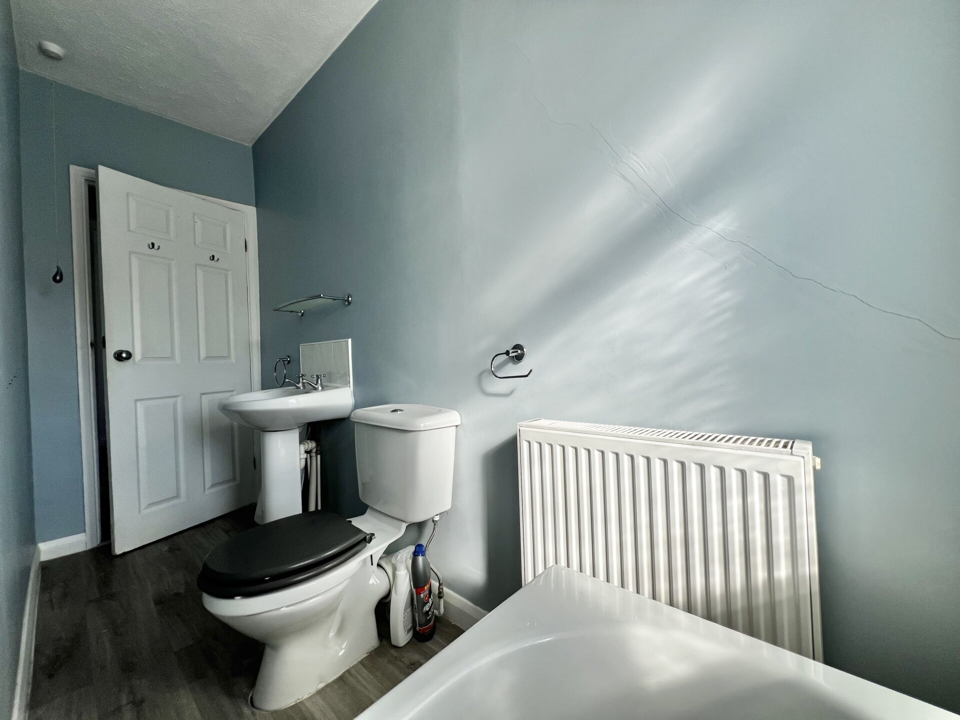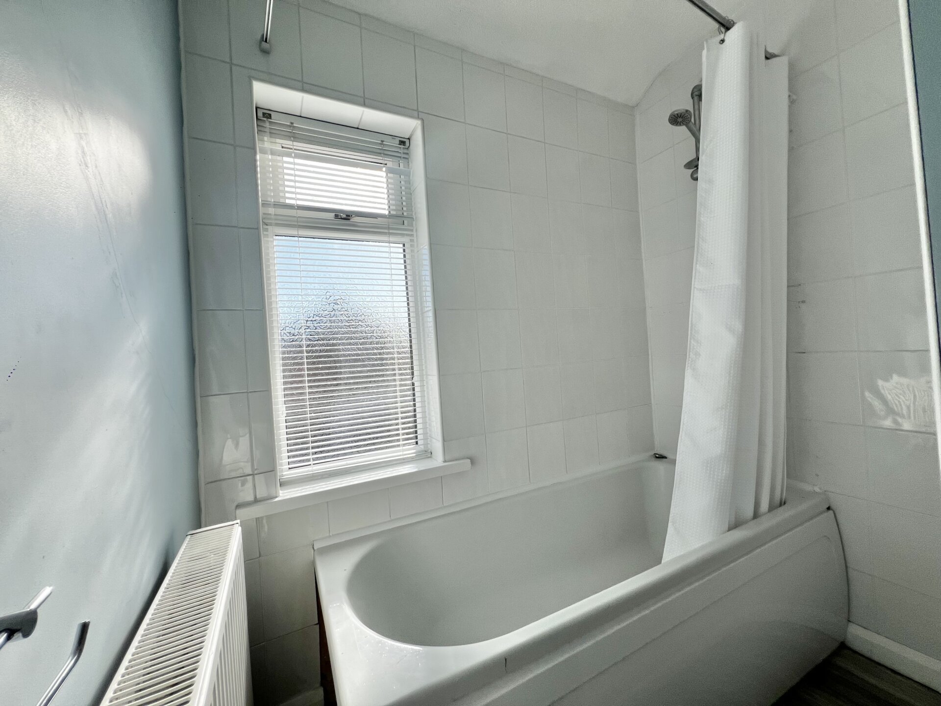 L-shape comprising a panelled bath with shower from the main, low flush w.c, pedestal wash hand basin, tiled walls and splashbacks, UPVC double glazed window and radiator.
